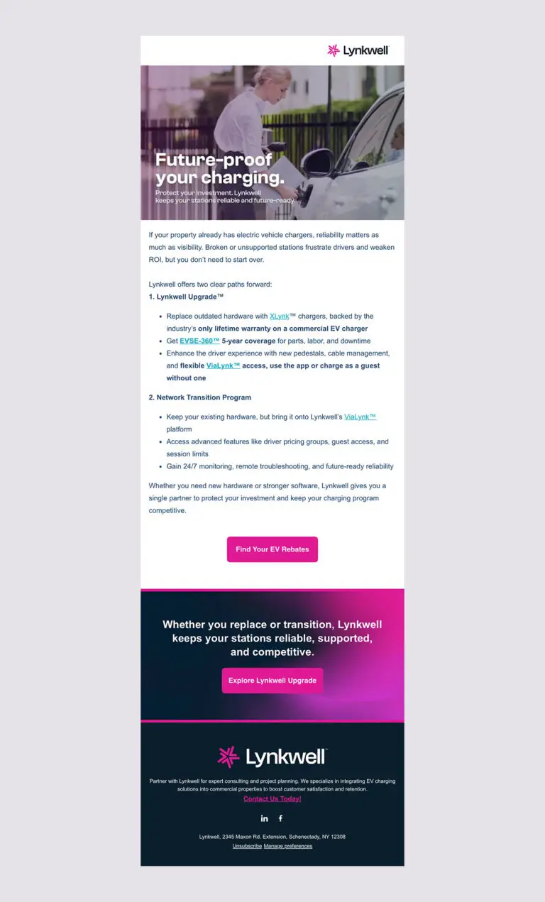 We transformed Lynkwell’s website into a scalable hub that expanded the brand’s visual system while making complex EV charging concepts easy to navigate. The experience was intentionally structured to support every level of familiarity—from first-time learners to technical decision-makers—using clear hierarchy, modular layouts, and a consistent visual language that educated without overwhelming and supported sales at every step.